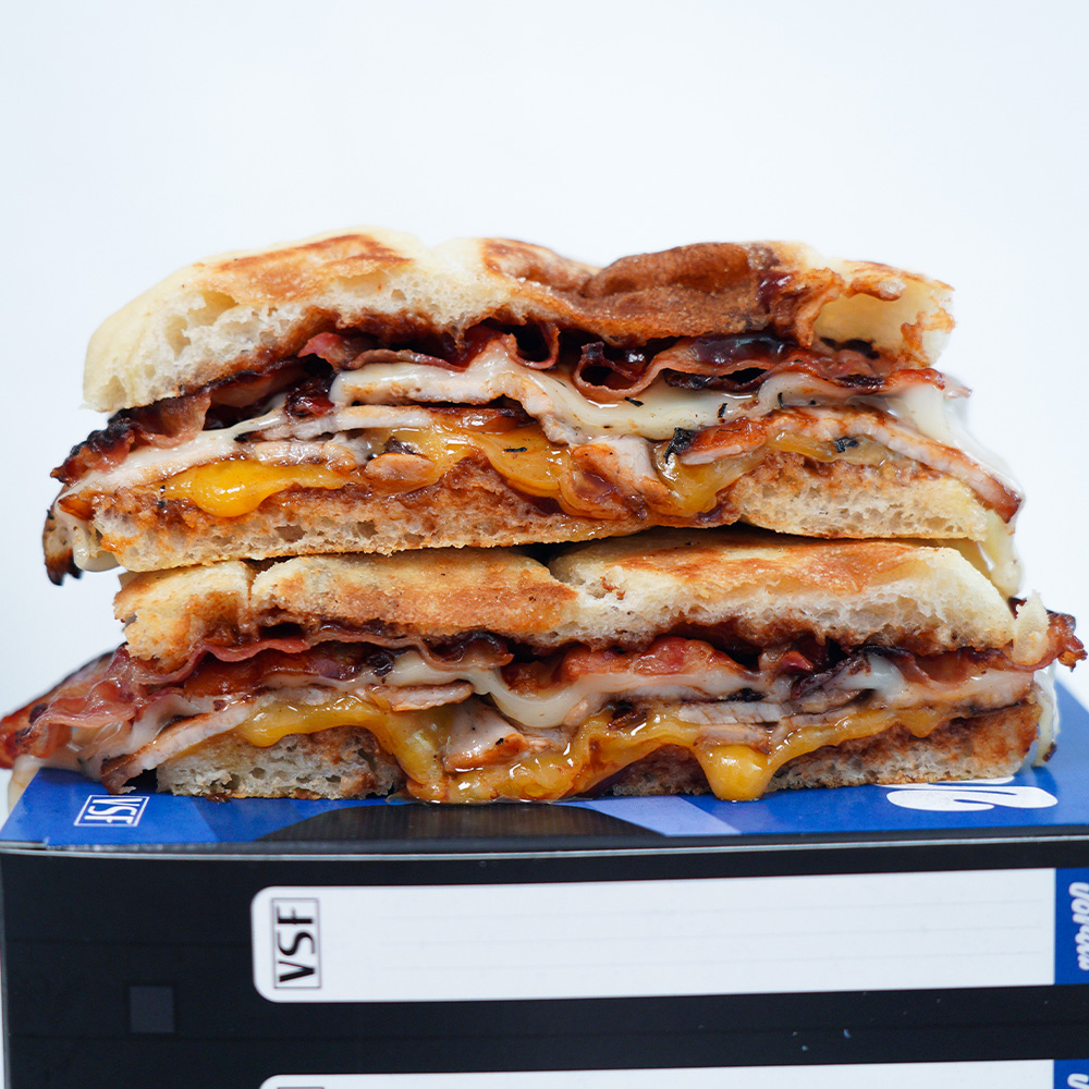Pan de focaccia esponjoso con panceta a baja temperatura, bacon crujiente, doble de queso fundido y salsa barbacoa ahumada.
